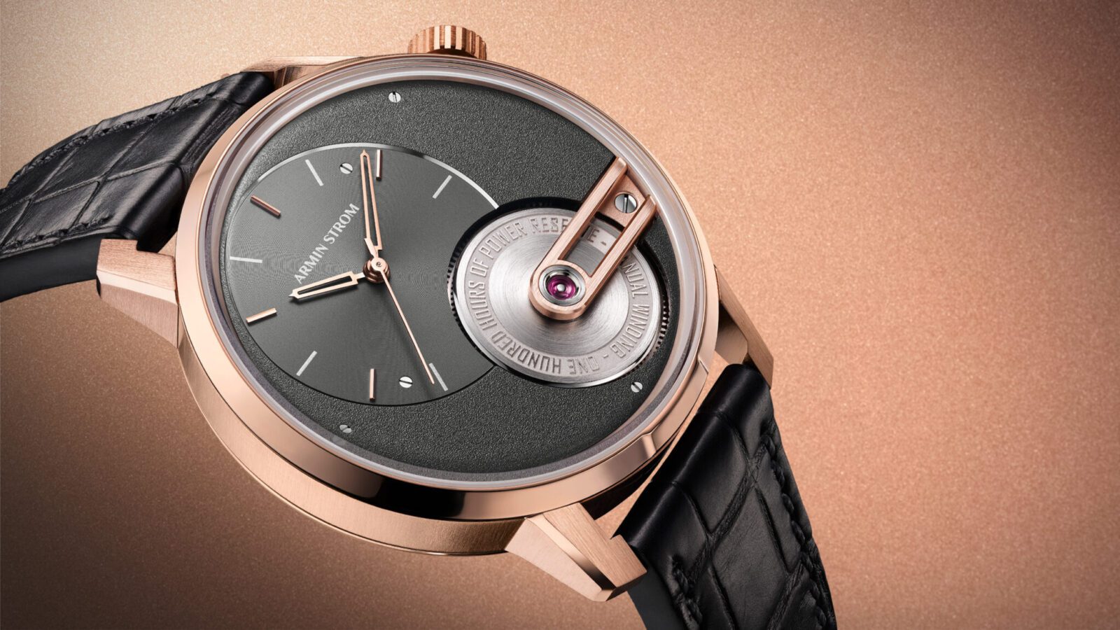 Pouzdro z růžového zlata o průměru 38 mm a výšce 9,38 mm je spíše elegantní než sportovní, byť má posunutou korunku na pozici 2, jako vyvážení disproporce na číselníku se třemi zlacenými ručkami v kruhu vlevo nahoře. Po technické stránce je tím nejdůležitějším to, co je pod můstkem, tedy pérovník s nápisem na víčku informujícím o rezervě chodu 100 hodin. Tedy 4,16 dne, což zajišťuje s rezervou, že v pátek odložené hodinky v pondělí ještě půjdou. Samozřejmě, když je v pátek natáhnete, protože jde o časomíru s ručním nátahem. Caliber AMW21 není rekordmanem značky v délce chodu na nátah, zato ideálním kompromisem. A to jak poměrně nízkého počtu 135 dílů kalibru, kamenového uložení (21), tak zvolené frekvence 25 200 polokmitů/h. Společně s průměrem pouzdra a přímočarým designem je to startovací čára nové éry značky Armin Strom. Ve zlaté verzi pak s notnou dávkou noblesy, čemuž musí přirozeně odpovídat cena, a to 24 900 CHF (od okamžiku uvedení vyšší o 1000 CHF). Poslední větu vnímejte jako pobídku – ceny hodinek kategorie haute horlogerie, navíc v edici jen 100 ks dolů prostě nejdou.