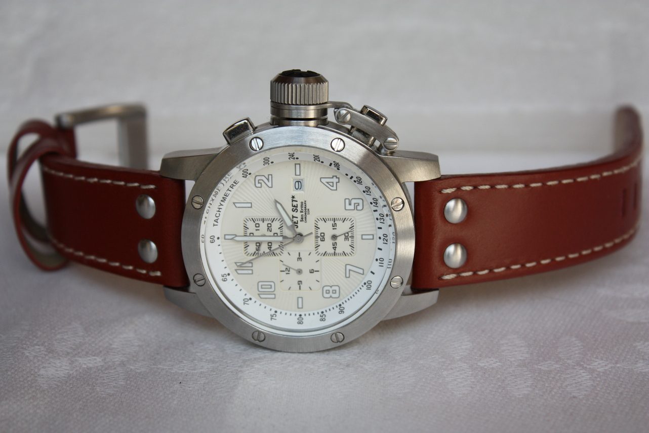 Charakteristika: Quartzové hodinky s chronografem a trojicí sčítačů, doplněných o zobrazení data na pozici 3. Sklíčko je minerální, pouzdro je z kartáčované leštěné oceli s osmi šrouby na lunetě. Masivní ochrana korunky je šroubovaná s povrchem z kaučuku. Řemínek je kožený s dvojicí nýtů u každé stěžejky. Vodotěsnost 50 metrů. Zakoupeno nové v ČR, nepoužívané.
