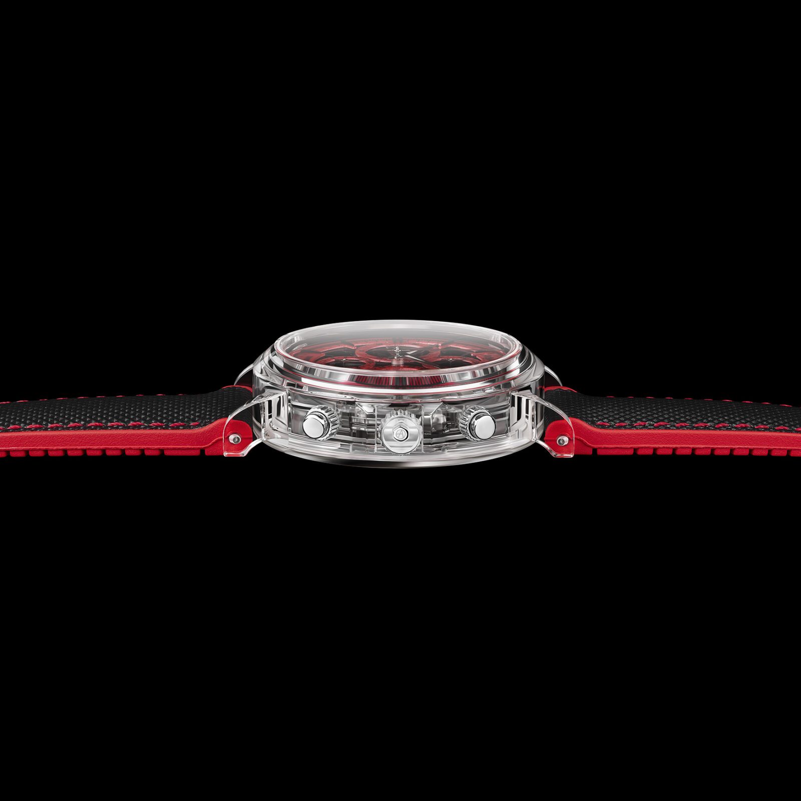 Přirozeně, že největší pozornost poutá právě verze se safírovým pouzdrem o průměru 43 mm v červené barvě a ručně skeletovaným číselníkem i strojkem. Zcela průhledné pouzdro, a to ze všech stran, působí mimořádně křehce. Nicméně safír je třetím nejtvrdším materiálem, když jim vévodí diamant. Přesněji, safír je na mohsově stupnici tvrdosti (do čísla 10), na pozici 9. Chcete-li, jde o tvrdost 1800 vickersů.