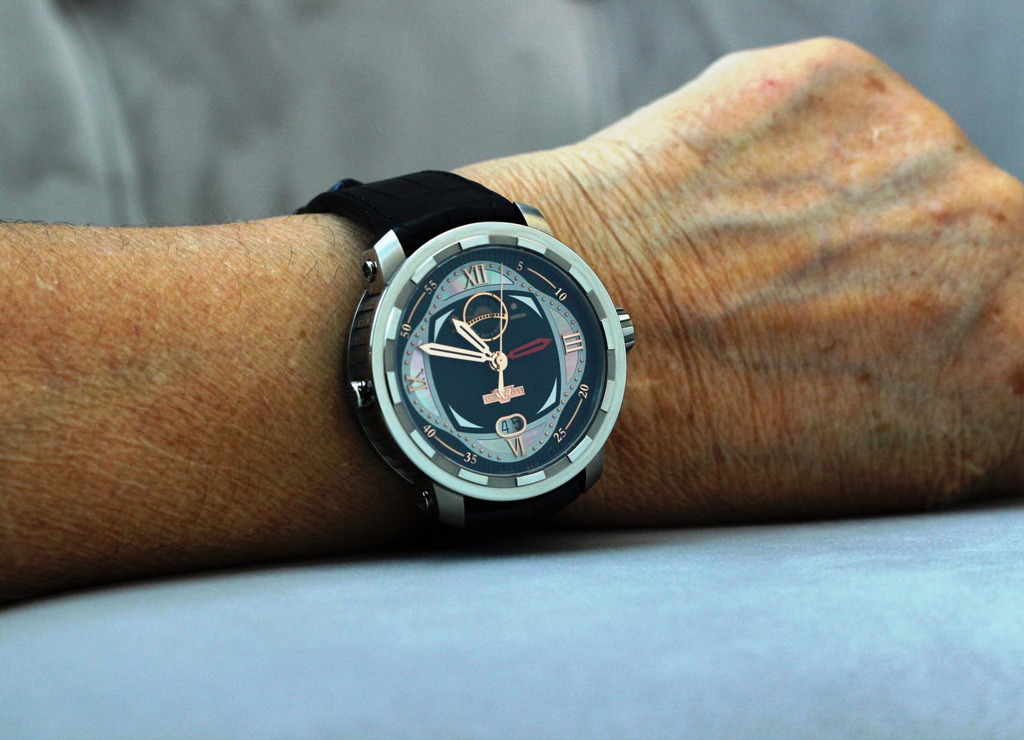 Od uvedení se kus design výrazně posunul. DeWitt Manufacture v Meyrin, založená roku 2000, je totiž vskutku kompletní manufakturou, schopnou vyrábět téměř vše, od pouzder, přes strojky až po číselníky a ručky. Právě faktu, že může manufaktura tvořit číselníky podle vlastních návrhů, si pan Jérôme de Witt mimořádně cení a při naší návštěvě jeho výroby na okraji Ženevy nám to hned několikrát zdůraznil. U tohoto modelu je kombinací gilošování, perleti a plastických zlatých římských čísel. Nad číselníkem pluje trojice zlatých ruček doplněná čtvrtou, červenou GMT.