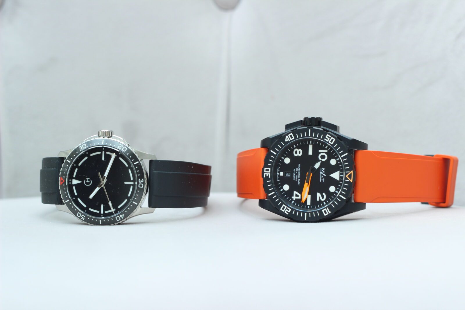 Co tedy napověděl vzhled obou kusů? Diver Pro Destro od M.A.T. je ryzí potápěčská časomíra. Masivní, s velkou korunkou o průměru 8,97 mm (konkurent 7,40 mm), kterou uchopíte i v potápěčských rukavicích. V koženém pouzdře je i druhý textilní řemínek dostatečně dlouhý pro umístění časomíry na neoprenu.