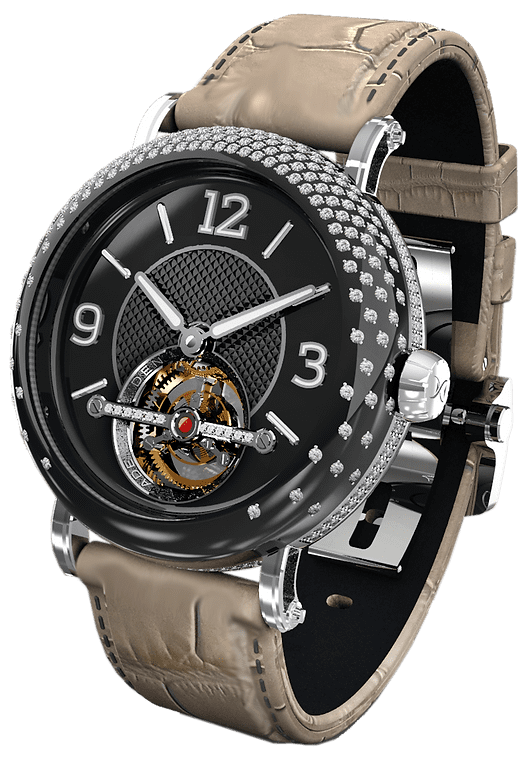 A tak je pouzdro o průměru 44 mm z černé keramiky poseto diamanty kvality VVS1. Výrobce hovoří o světovém prvenství zasazení 169 čirých diamantů do keramiky. Dalších 176 je pak v pouzdře z bílého zlata.
