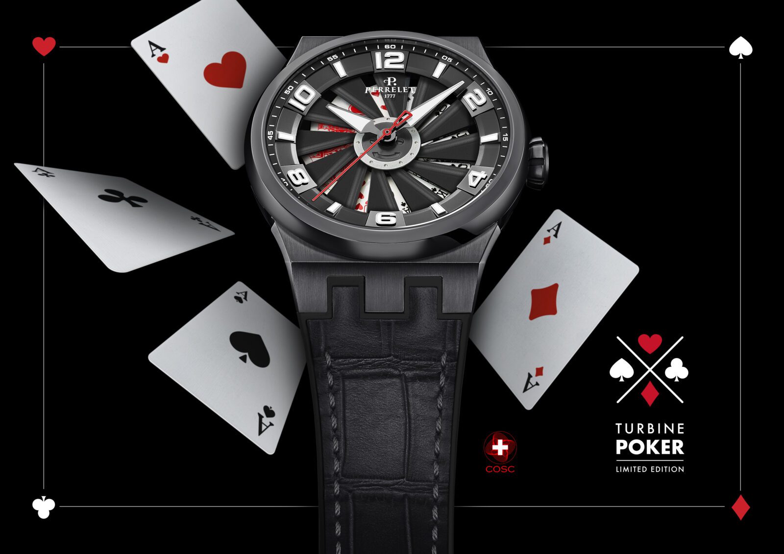Kouzlo řady Perrelet Turbine zrozené v roce 2009 je v tom, že nabízí nekonečně možností, jaké téma zvolit pro číselník pod 12 lopatkami „turbíny“ u černěného hliníku. Co už designéři všechno nevymysleli za témata: sex, šerifskou hvězdu, draka, pilotní a potápěčskou symboliku a další. V této hře s náměty se teď rozhodli vyložit karty na stůl ve verzi Turbine Poker.