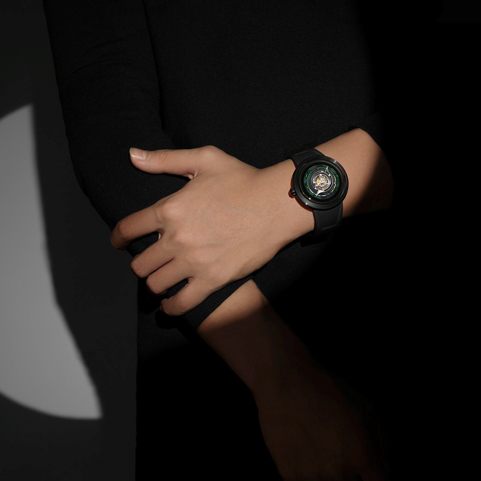 Současnou novinkou je pak centrální Tourbillon Black Hole v pouzdře v oceli 904L (průměr 46 mm, voděodolnost 50 m) s černým a gun povlakem a vnitřním okružím z kovaného karbonu v jedné ze šesti barev pryžového tahu.