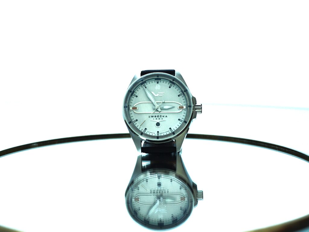 O podobnostech velkých kol a koleček, automobilů a hodinek se toho napsalo mnoho, ovšem zdaleka ne všechny časomíry mají tolik společného jako v tomto případě. Nejde o tradiční přenesení rychloměru z palubní desky na číselník. Naopak Vostok Europe zvolil to typické ze škodovky – její masku. Protáhlý ovál s chromovaným rámečkem a oranžovými směrovými světly na bocích je centrem číselníku, doplněný o nápis embéčko a plastickou linku s očkem pro datumovku. Obdobně jako tomu je na masce vozu, přezdívané široký úsměv. Vše doplňuje letopočet 1964.