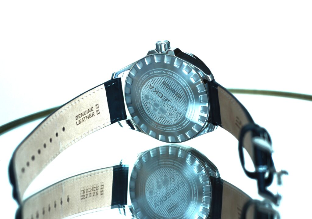 Pokud se budeme držet čísel, tak jistou podobnost mezi embéčkem určeným na silnici a na zápěstí rovněž najdeme. Na délku měl vůz 4,155 metru, když luneta časomíry má 44,84 mm. Blíže jsou si jiné parametry – vůz měl na šířku 1,62 m a výška pouzdra z oceli (voděodolnost 200 m) činí 16,9 mm. Už tato čísla napovídají, že pouzdro je masivní. V průměru jsme naměřili při testu 46,77 mm, s korunkou 51,02 mm a nožkami 54,35 mm. Rozměrům odpovídá i hmotnost 121,9 g. Hovoříme tedy o masivním modelu se zajímavými detaily nápaditě odkazujícími na embéčko. Snad jen škoda že nebyla designérsky využita typická mřížka na zadním blatníku přezdívaná žábry. Nám se nejvíce zamlouvaly barevné verze. Ale volte sami – červená a modrá nebo bílá a černá?
