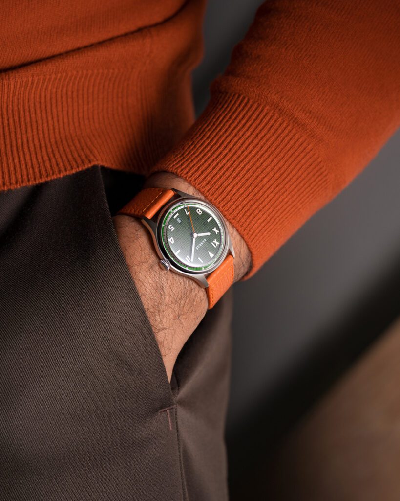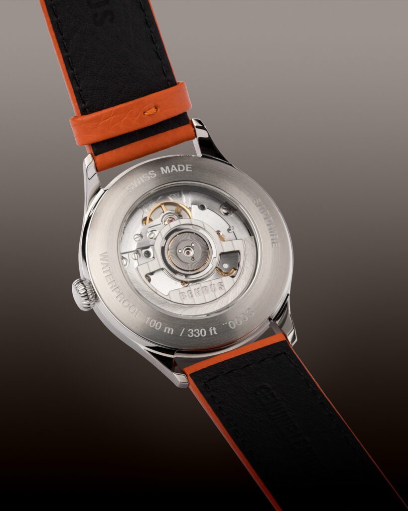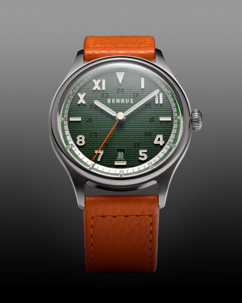 Naše slova dokládají především detaily. Vezměme samotný číselník. Je v barvě Highland Green, který kopíruje odstín sportovního kupé Ford Mustang GT Fastback, který si zahrál ve filmu. Zároveň texturovaný povrch číselníku odkazuje na ikonickou mřížku na boku vozu, odkud se přiváděl vzduch k motoru. Do třetice, pokud jde o číselník, nese styl kalifornského zobrazení hodin. Onen designový prvek odkazuje k roku 1968 a zrození stylu, kdy je horní polovina číselníku osázena římskými číslovkami a dolní arabskými. Vznikl u opravářů hodinek v Kalifornii a brzy se stal tak populární, že si ho nechávali majitelé hodinek vyměňovat za neporušený, originální číselník svých nových hodinek. U Benrusu je doplněný ještě o vnitřní kruh malých číslovek 24hodinového zobrazení.