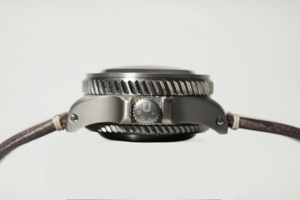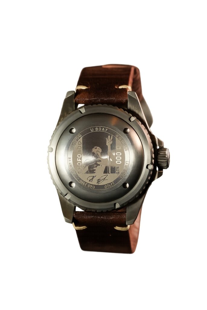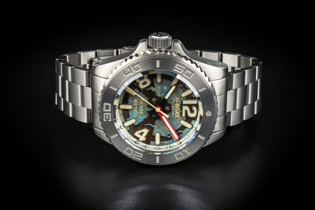 Jednosměrná luneta s ozubením pro otáčení v potápěčských rukavicích nezaujme tolik, jako imitace zoxidovaných částí trojvrstvého číselníku, samozřejmě záměrně, ručně provedená, a tedy u žádného kusu se jeho kresba zcela neopakuje. Ony zoxidované části najdete také na obrubě pod sklíčkem s 12 hlavami šroubů, takže máte tak trochu pocit jako když se díváte do okénka ponorky Nautilus. Název románu Julese Verna trochu klame, protože ono označení 20 000 mil pod vodou nehovoří o hloubce, ale délce plavby. Ona totiž francouzská míle měla asi 3,7 km, tudíž je řeč o cestě dlouhé 74 000 km. Věřme, že i to by U-Boat Profondo vydržel. Jeho pouzdro je totiž z masivního titanu, na pozici 3 má héliový ventil, korunka je na pozici 9 kryta výstupky a dýnko je zajištěno Locking Ring Systemem. Šroubovacím dýnkem s ozubením po vnějším obvodu, aby se dalo odpovídajícím způsobem zatáhnout a zajistila se tak mimořádná voděodolnost. Na dýnku je laserově gravírovaný římský bůh moří Neptun se svým trojzubcem.
