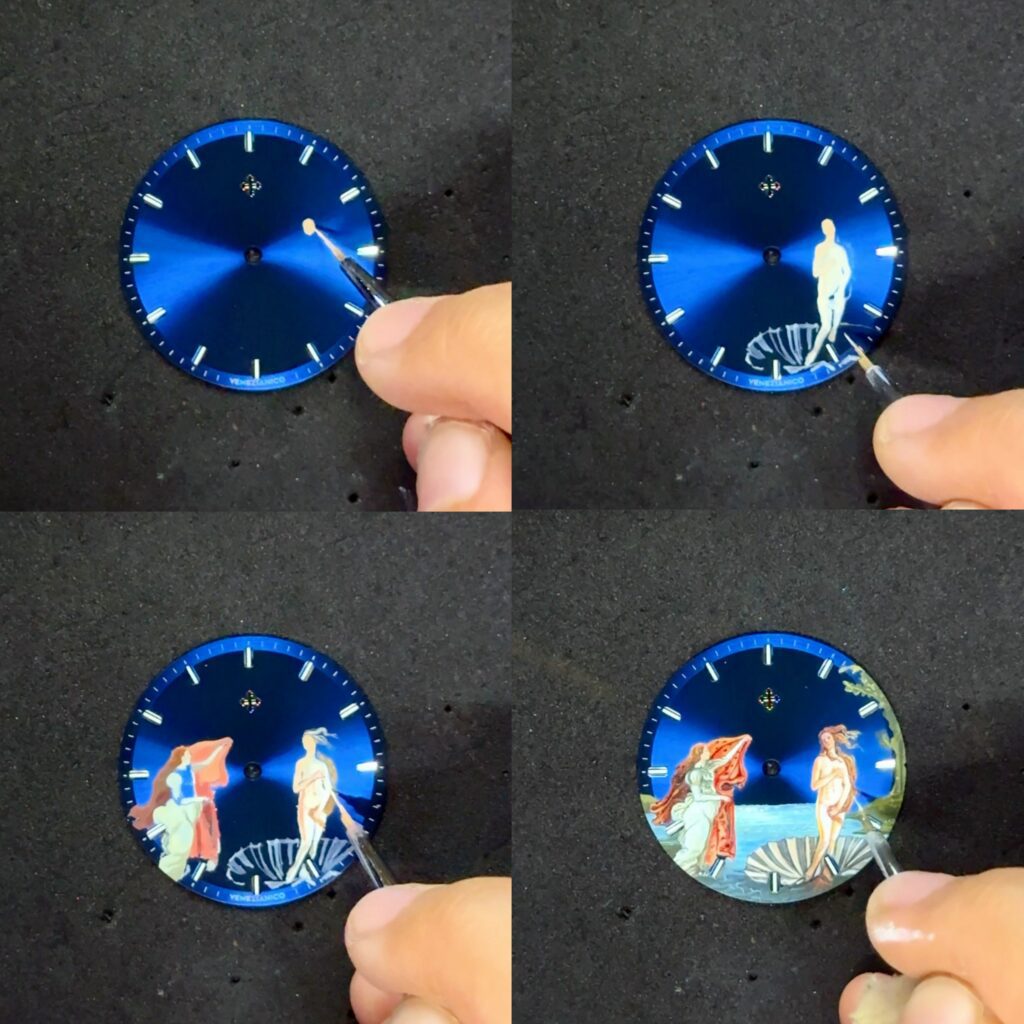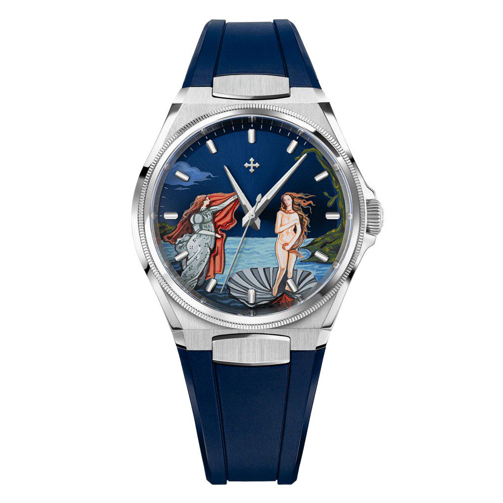 Samozřejmě, že o kusu Arzenale (odkazuje na nejstarší „průmyslovou“ benátskou loděnici světa) s obrazem Zrození Venuše to platí dvojnásobně. Trochu překvapí, že kompozice obrazu Boticelliho je na číselníku pozměněna a centrální postavy jako by si vyměnily místa. Musíme přijmout, že je samozřejmě něco jiného malovat na velké plátno a na malý číselník.