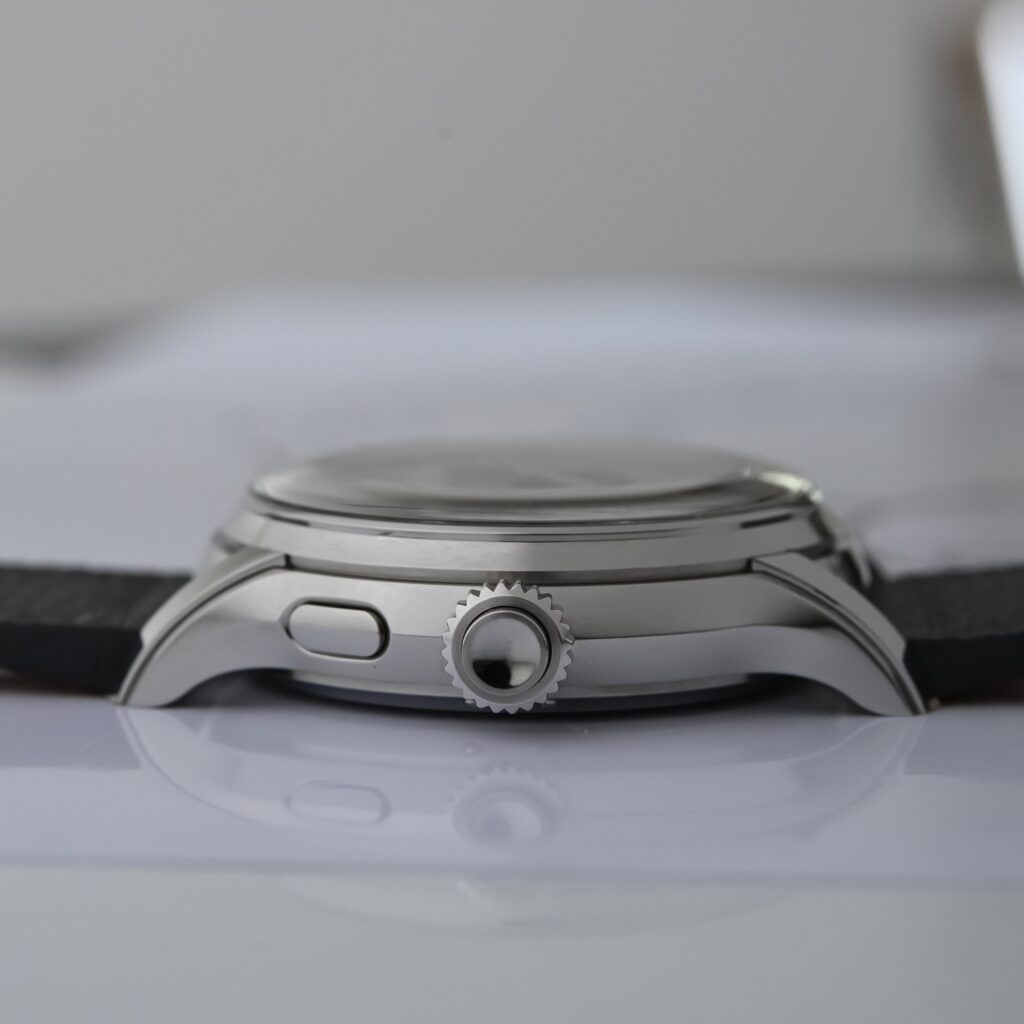 Oboje – bezpečné a uživatelsky příznivé, platí i pro platinové pouzdro o průměru 38 mm a výšce 10 mm. Co si pod tím představit? Fakt, že 85 % hmotnosti pouzdra tvoří platina 950, ovšem střední díl, nožky a korunka jsou pokryty vrstvou oceli 904 L, aby se platina vyhnula škrábancům a dalším poškozením, které se na platině neodstraňují právě snadno. Jako ochranu můžete označit i výklopné kovové dýnko překrývající safírové sklíčko. Já bych to spíše nazval milou poetikou připomínající staré dobré časy prvních ročních kalendářů.
