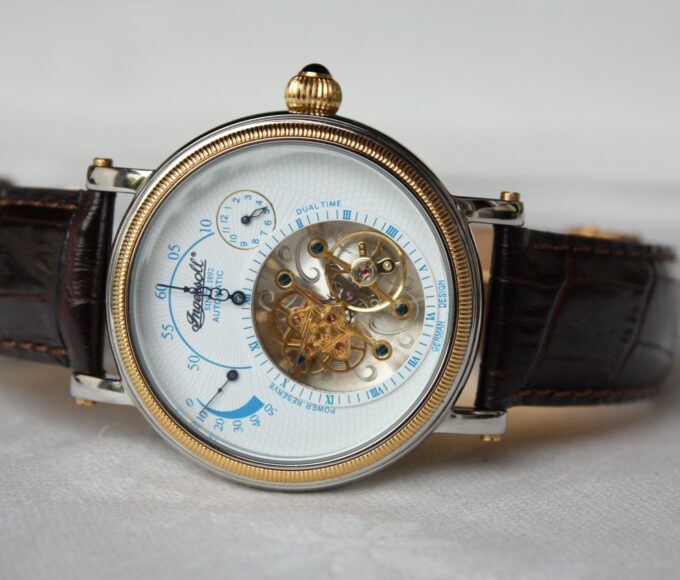 Značka: Ingersoll Model: Polk Charakteristika: Mechanické hodinky s automatickým nátahem s pouzdrem z oceli, korunkou (s kabošonem- umělý kámen) a lunetou imitující zlacení. Jde o regulátor...